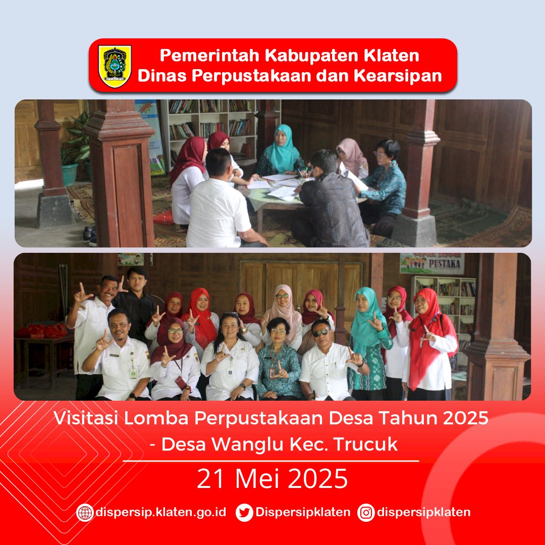 Rabu, 21 Mei 2025, tim panitia dan dewan juri Lomba Perpustakaan Desa se-Kabupaten Klaten Tahun 2025 melanjutkan rangkaian visitasi hari kedelapan ke dua desa yang memaksimalkan ruang dan potensi lokal untuk menghidupkan literasi, Desa Wanglu di Kecamatan Trucuk dan Desa Srebegan di Kecamatan Ceper.
